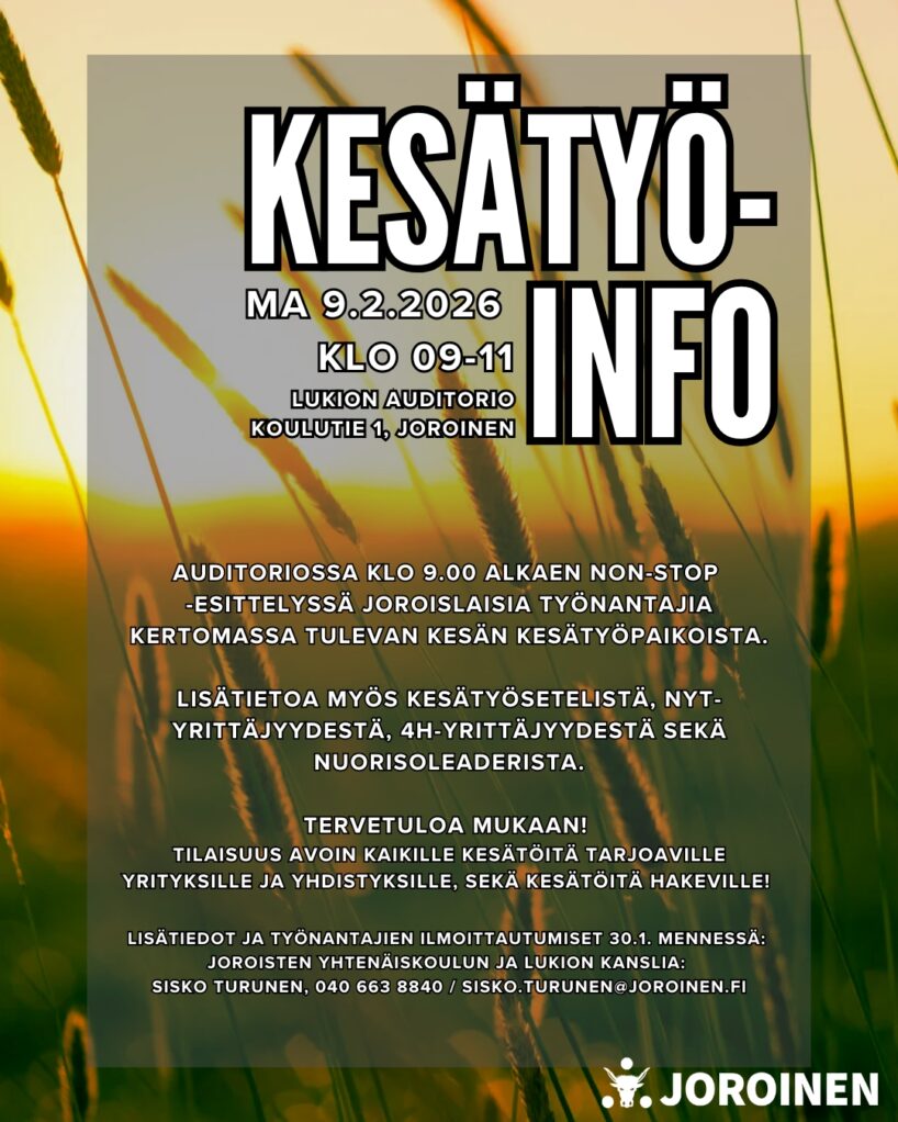 Kesätyöinfo työnantajille ja kesätyönhakijoille järjestetään lukion auditoriossa maanantaina 9.2.2026 klo 9-11.