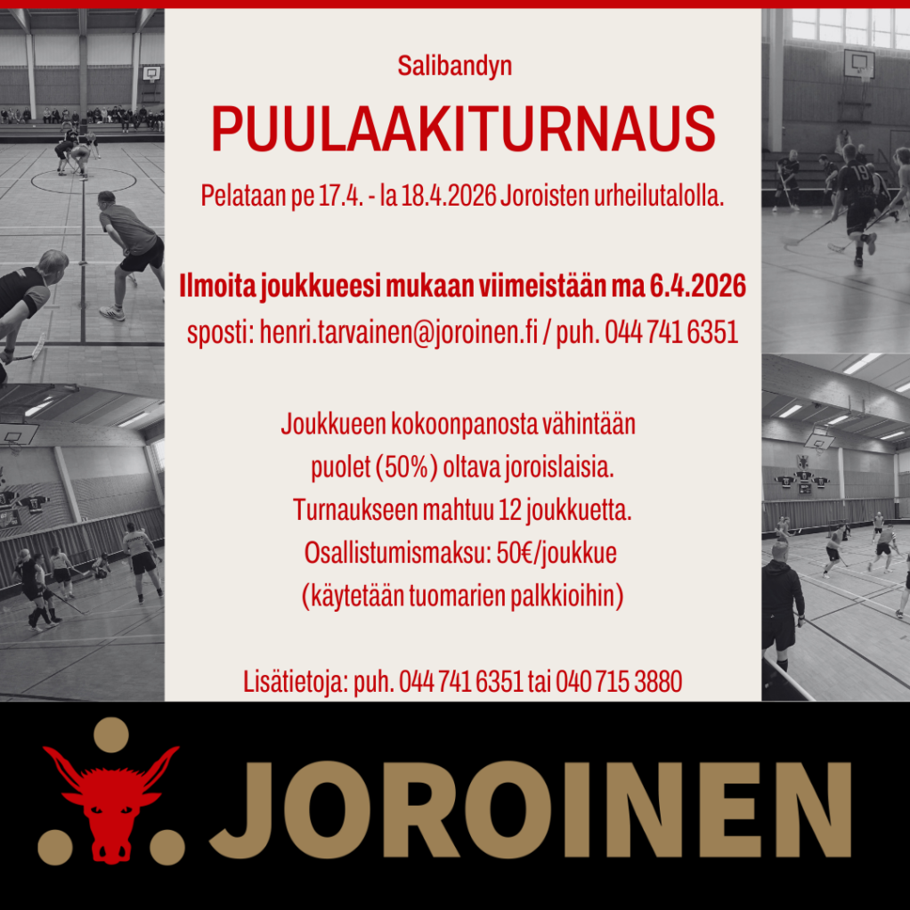 Joroisten salibandyn puulaakiturnaus pelataan tänä vuonna 17. – 18.4.2026 urheilutalolla.