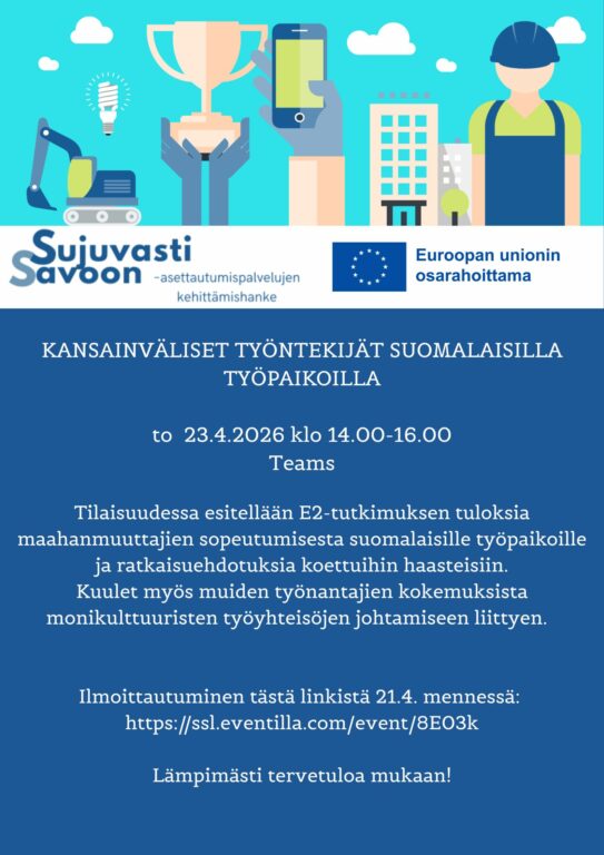 Sujuvasti Savoon -hanke järjestää etätilaisuuden, jossa kuullaan E2-tutkimuksen tuloksista liittyen kansainvälisiin työntekijöihin suomalaisilla työpaikoilla. Tutkija esittelee myös ratkaisuehdotuksia koettuihin haasteisiin. Lisäksi kuulet suomalaisten työnantajien kokemuksia monikulttuuristen työyhteisöjen johtamisesta.