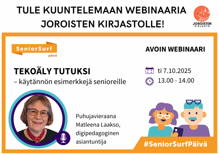 Joroisten kirjastolla tiistaina 7.10. klo 13.00 – 14.00 SeniorSurf-päivän webinaari Tekoäly tutuksi – käytännön esimerkkejä senioreille. Webinaarissa puhujana digipedagoginen asiantuntija Matleena Laakso.