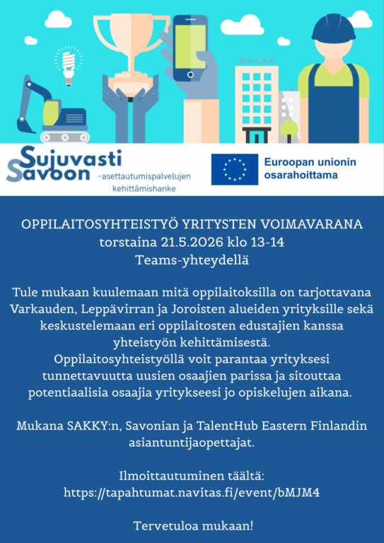 Tule mukaan keskustelemaan miten oppilaitosten ja yritysten yhteistyötä voisi kehittää jo nyt, sekä lähitulevaisuudessa. Sujuvasti Savoon -hanke järjestää etätilaisuuden Varkauden, Joroisten ja Leppävirran alueiden työnantajille, yrittäjille, sekä oppilaitosten edustajille 21.5. klo 13-14.