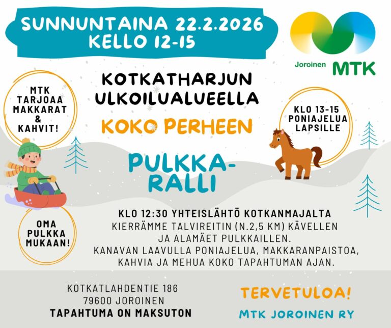 MTK Joroinen ry järjestää koko perheen maksuttoman pulkkarallitapahtuman sunnuntaina 22. helmikuuta klo 12–15 Kotkatharjun ulkoilualueella.
